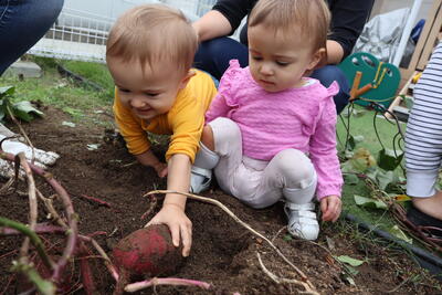 それぞれに楽しみを見つけ、保育者と戸外あそびを楽しんでいます