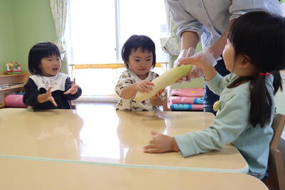 11月になり2名のお友だちが仲間入りし、すいかグループ(0歳児)は6名となりました。0歳児は月齢差があるため、体の成長や心の発達にも差があります。月齢差があっても同じ空間で一緒に過ごす中でお互いに刺激し合いながら過ごすことができました