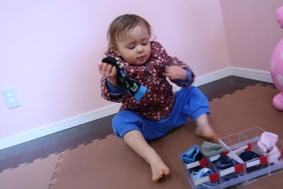 腕をこぶしでトントンして、リクエスト。自分の思いを身体を使って表現できるようになりました。